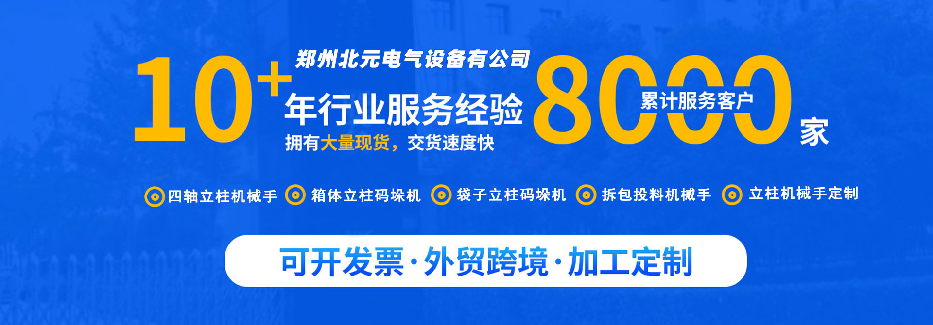 郑州北元电气设备有限公司坐落于美丽的河南省会“绿城”郑州,是一家以机器人技术为核心,致力于智能制造、智能装备领域及自动化码垛系统集成的研发、制造、应用和销售为一体的企业。 主营业务为提供码垛机器人、上下料机器人、堆垛机器人、拆垛机器人、立柱机器人、码垛机械手等工业机器人产品。 我们的产品广泛应用于粮油、食品、饮料、医药、化工、肥料、水泥、玻璃、摩擦材料、耐火材料、钢铁、建材等众多行业。