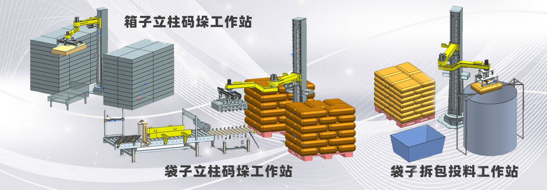 主营:纸箱码垛、袋子码垛、立柱上下料、夹具定制、输送装置、机器人非标自动化设计。